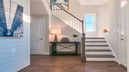 When hardwood stairs are selected we use this proprietary system. During the construction process, stairs are delivered to the job site without the finished treads and riser. The finished treads and risers are fabricated, custom stained and finished in a climate controlled factory offsite and installed at the end producing a beautiful staircase.