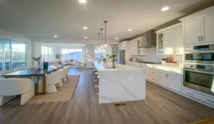 The designer kitchen showcases Bosch appliances, a 5-burner cooktop, and a dramatic oversized waterfall island perfect for cooking and gathering.